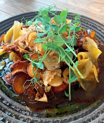 Boar wildly with goat cheese napkin dumplings, roasted root vegetables