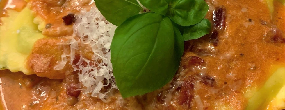Ricotta & Spinach Fresh Ravioli | Vodka Rosé Sauce | Fresh Bacon Lardons | Garden Basil